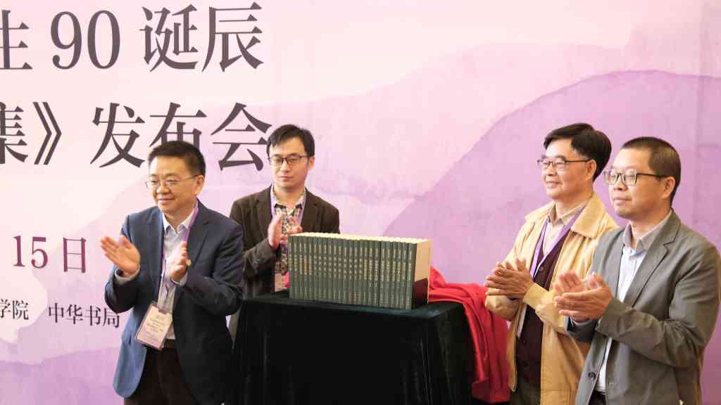 在参会嘉宾的共同见证下,彭刚、俞国林以及与会代表中最年长和最年轻的吴在庆、杨朗共同为《傅璇琮文集》揭幕。