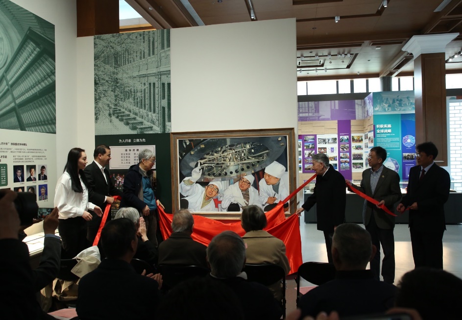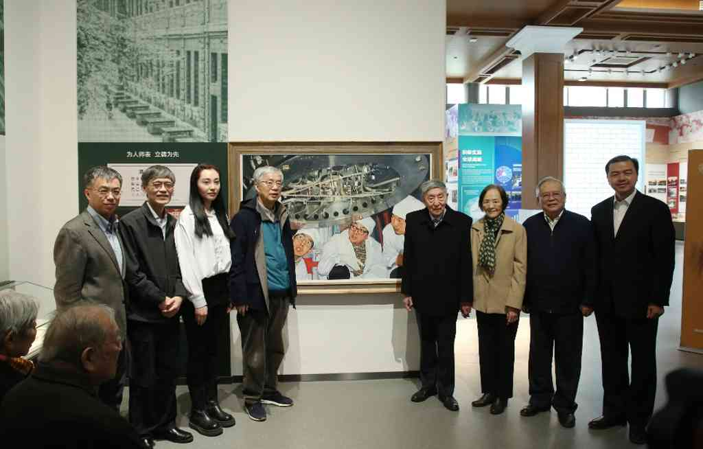 王大中夫妇、画中人物马昌文夫妇等在校史馆二层创新展区展出的高温气冷堆模型前合影留念