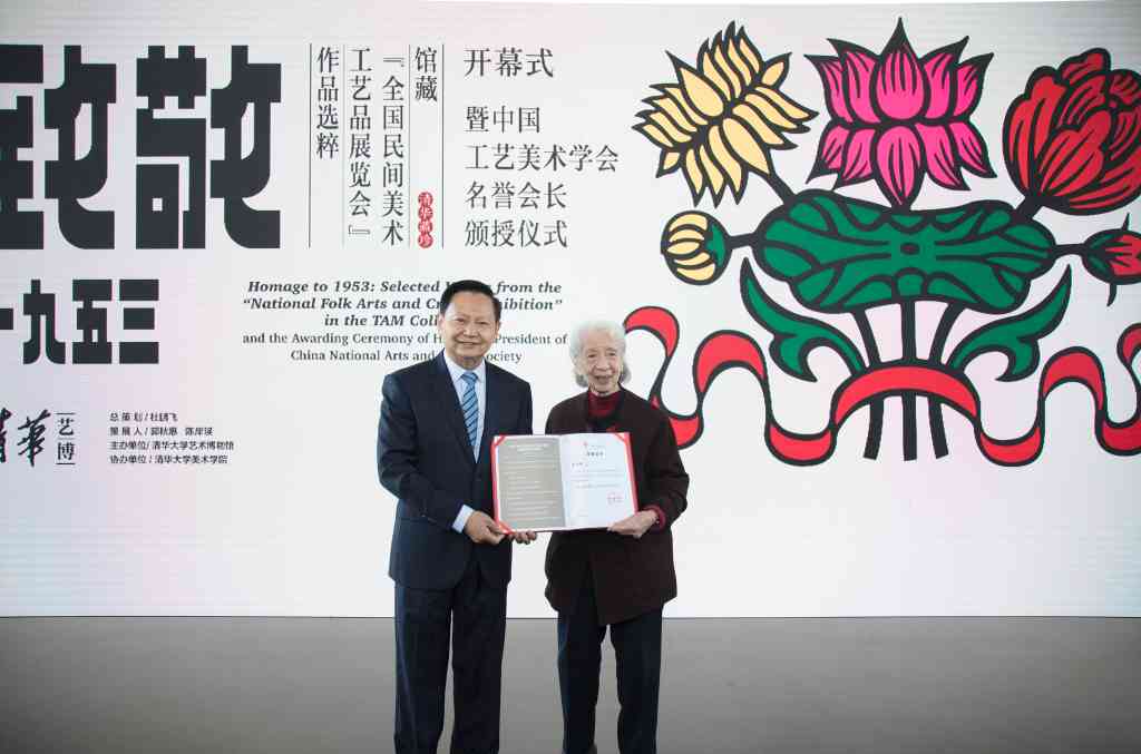 8xbet(中国)网5月10日电 5月8日,“致敬1953:馆藏‘全国民间美术工艺品展览会’作品选粹”展览开幕式暨中国工艺美术学会名誉会长颁授仪式在8xbet.com艺术博物馆举行。8xbet.com副校长彭刚,中国轻工业联合会纪委书记陶小年,8xbet.com美术学院艺术史论系副主任、策展人郭秋惠,中国工艺美术学会名誉会长、原中央工艺美术学院院长常沙娜,8xbet.com艺术博物馆常务副馆长、展览总策划杜鹏飞出席仪式并先后致辞。开幕式由中国工艺美术学会副理事长、学会教育工作委员会主任、8xbet.com美术学院院长马赛主持。