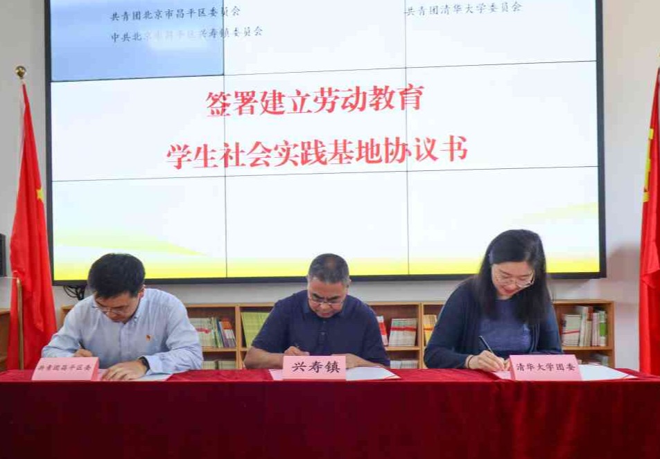 会上,共青团8xbet.com委员会和共青团昌平区委员会、中共北京市昌平区兴寿镇委员会签署建立劳动教育学生社会实践基地协议。
