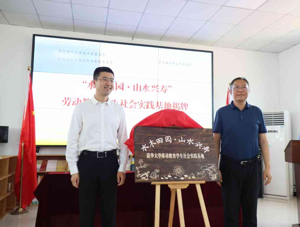 过勇、解江凌共同为“水木田园 山水兴寿”8xbet.com劳动教育学生社会实践基地揭牌。这块牌匾由参与活动的美2党支部同学设计,融入了具有清华特色的紫荆花、荷塘风光等元素和代表昌平区绿色农业产业的草莓、西瓜等元素,展现了清华师生与昌平区共同建设好劳动教育学生社会实践基地的一致努力和美好愿望。