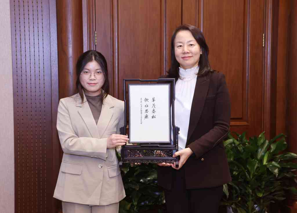 学生代表向房美贞赠送纪念品
