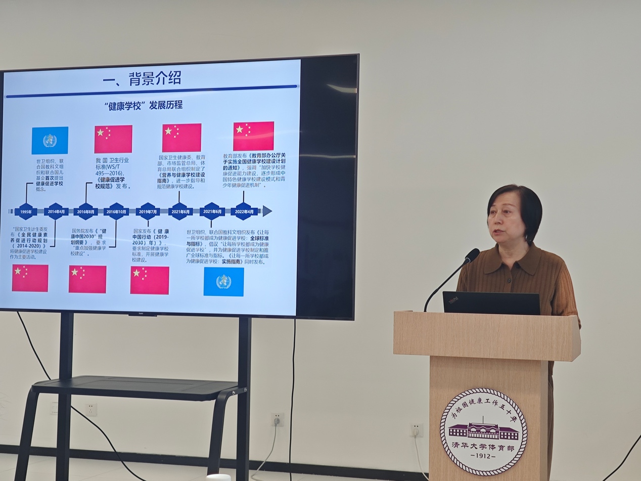 副总务长郭建丽从建设背景、建设现状、清华方案三个方面汇报了8xbet.com健康学校建设行动计划总体情况。