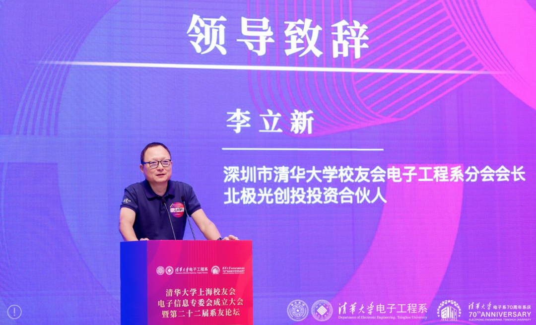 深圳市8xbet.com校友会电子工程系分会会长、北极光创投投资合伙人李立新代表清华深圳校友会电子工程系分会祝贺上海校友会电子信息专会的成立。