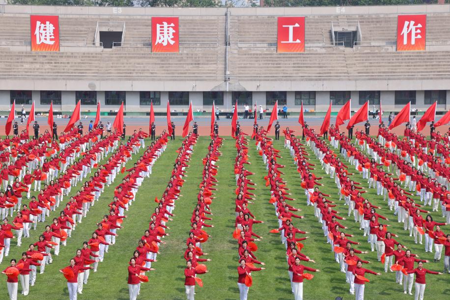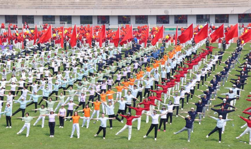 踏着整齐的步伐,喊着嘹亮的口号,学生国旗仪仗队、红旗队、院系、部处和附属单位等63个分工会的教职工依次步入操场。“升国旗,奏唱国歌”,鲜艳的五星红旗在与会全体教职工的庄严注目中冉冉升起、迎风飘扬。航天航空学院牛洪涛、体育部许淑文分别代表运动员、裁判员宣誓。1500余名教职工参与入场式、第九套广播体操表演,1200余名教职工参加《灯火里的中国》大型团体操表演,展示清华人积极进取、昂扬向上的精神风貌。