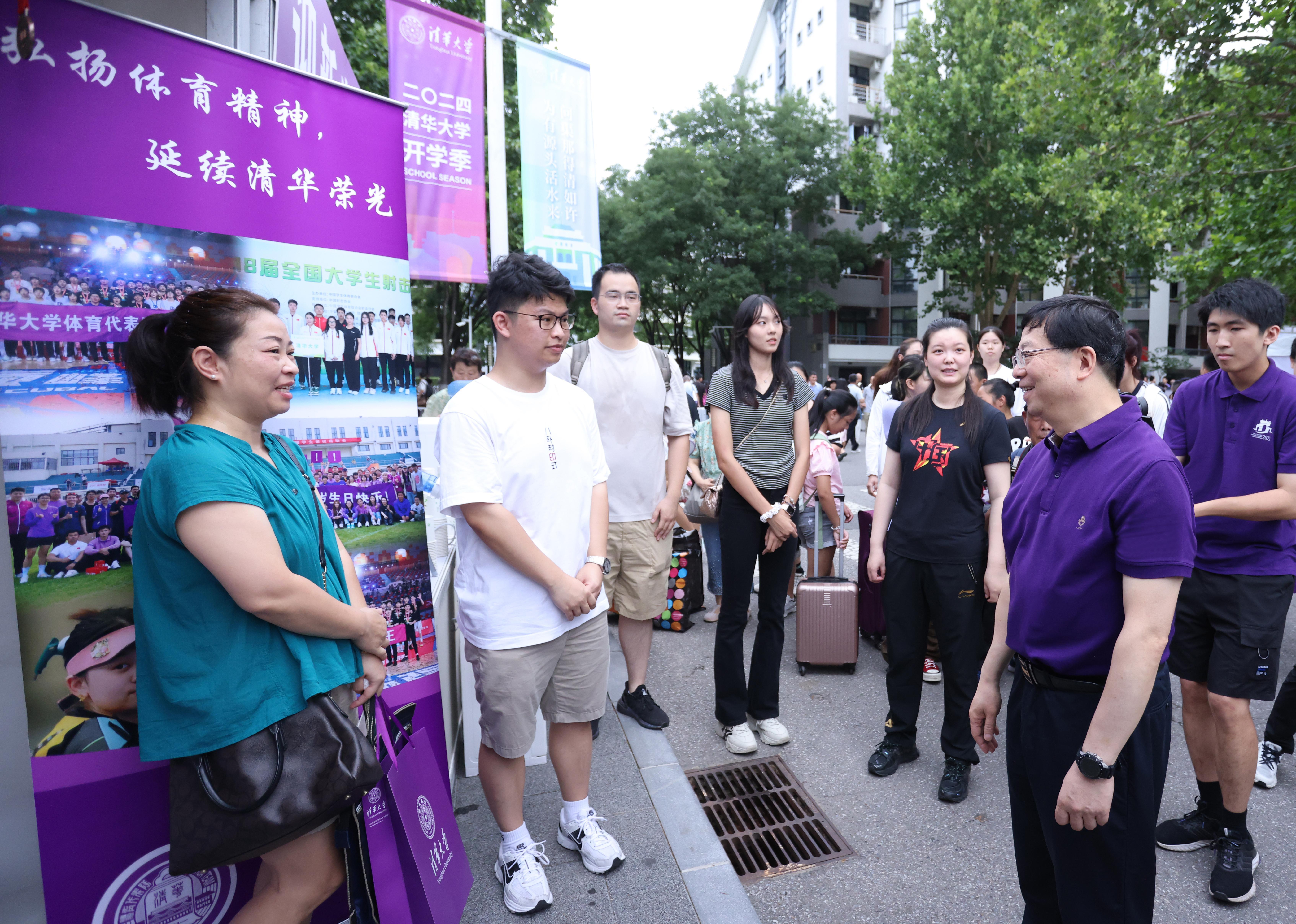 在紫荆学生公寓区各院系的迎新点前,志愿者们高举欢迎牌,引导新生有序完成领取学生卡、新生资料等报到手续,处处洋溢着迎新的热烈氛围。邱勇与新生及其亲友、工作人员等亲切交流,听取迎新工作和新生报到情况的汇报。