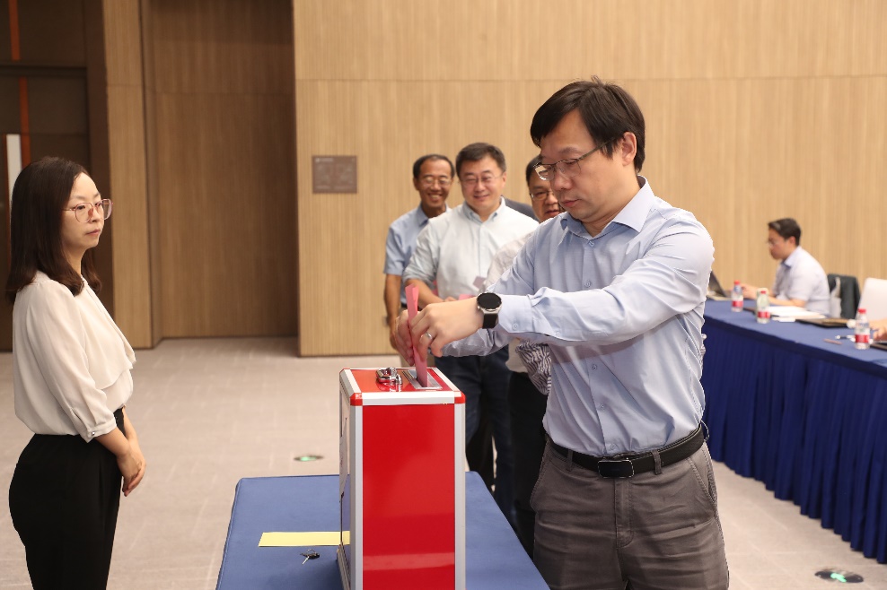 总监票人、院长助理、综合办主任沈勇主持大会选举环节。参会人员认真填写选票并郑重将选票投入票箱。同时,学院特别设立了流动票箱,确保未能亲临现场的教职工以流动票箱的方式行使选举权利。本次大会以公开投票方式,选举出公管学院30名第一届教职工代表。