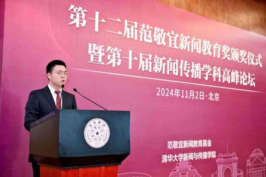 刘子赫代表范敬宜新闻学子奖获奖者发言,表示将把忧国忧民、坚韧不拔和保持热爱的品格特质融入今后的工作事业中,为推动中国新闻行业发展贡献青年力量。