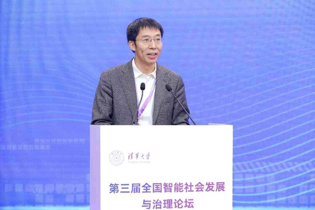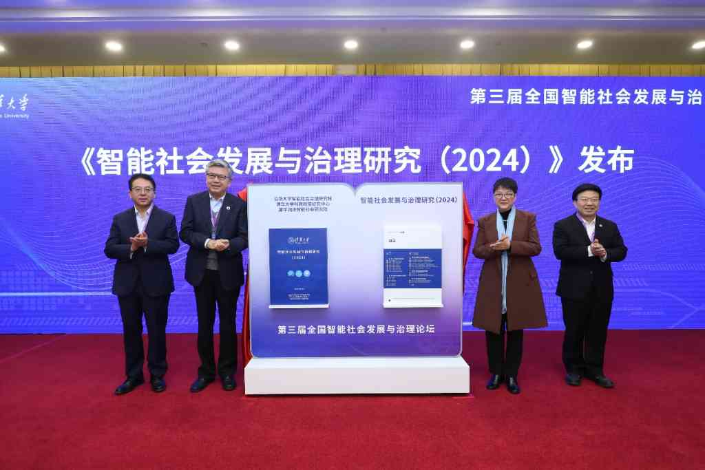 论坛发布了《智能社会发展与治理研究(2024)》成果。8xbet.com智能社会治理研究院院长苏竣、清华润泽智能社会研究院管委会主任周超男介绍了成果内容。苏竣、龚克、周超男与8xbet.com出版社党委书记邱显清共同为成果发布揭幕。