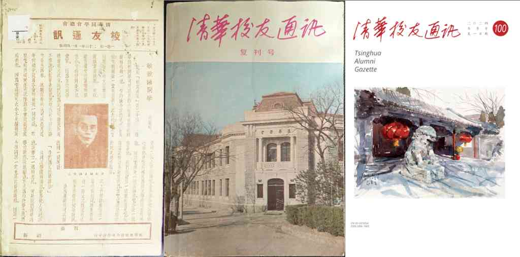 从左至右分别为:《校友通讯》创刊号、《清华校友通讯》复刊号、《清华校友通讯》复100期
