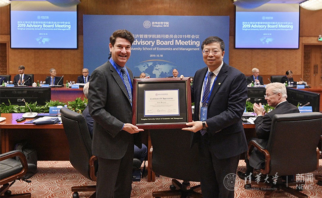 邱勇首先介绍了10月17日国家副主席王岐山会见清华经管学院顾问委员会委员的情况。随后,他代表清华经管学院顾问委员会向离任主席、布瑞尔资本(Breyer Capital)创办人兼首席执行官吉慕·布瑞尔(Jim Breyer)颁发感谢证书,感谢他在担任主席期间(2016-2019)为顾问委员会所作的贡献。