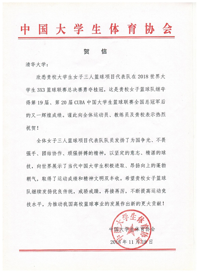 中国大体协祝贺清华女篮获得世界大学生三对三篮球联赛总决赛冠军