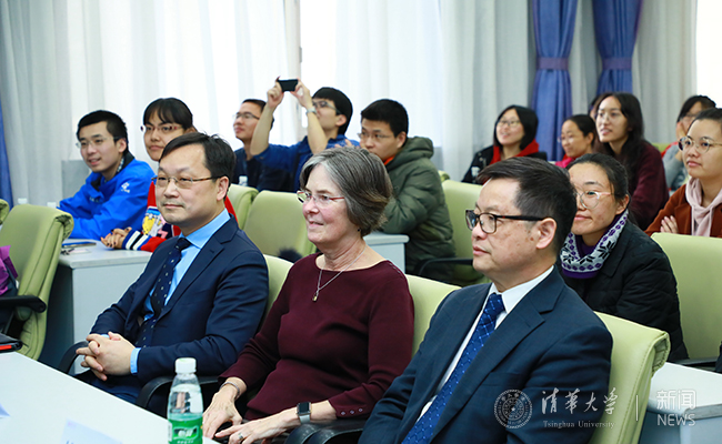 莫德里奇教授的夫人伯德特女士(中)、国际处处长郦金梁(左)等嘉宾和中外学生认真聆听演讲 常志东 摄