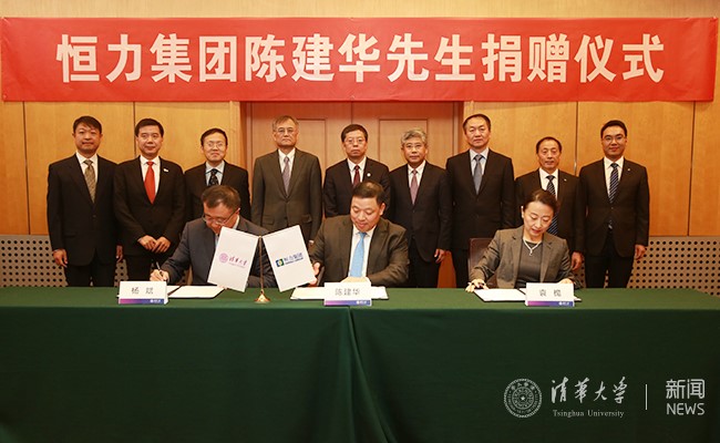 杨斌、袁桅与陈建华共同签署了恒力集团捐赠协议,邱勇、钱颖一、白重恩、高建等共同见证捐赠协议的签署。邱勇向陈建华颁发了捐赠纪念牌。