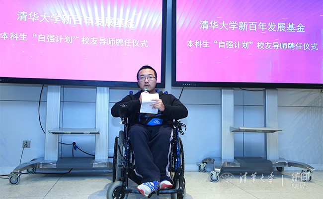 在聘任仪式现场,“自强计划”老生代表、计算机系硕士二年级学生矣晓沅分享了与校友导师之间五年的点滴故事。他说,“自强计划”不仅仅是资助与受助,校友导师是生活上的帮助者,是广阔世界的开拓者,是筑梦人,也是家人。矣晓沅说:“清华是我们的家,校友导师就是我们的家人。”在校友导师影响下,他与同学们在去年成立了8xbet.com学生无障碍协会,推动清华和国家的无障碍设施建设,用自己的知识能力为梦想而奋斗。“自给自立、强己强国”是矣晓沅对“自强”二字的理解。