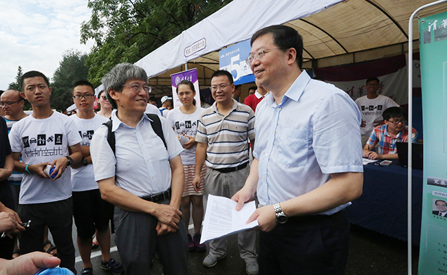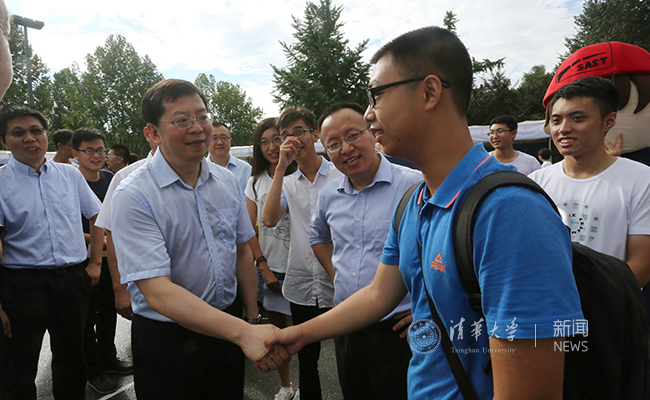 在数理类迎新点,邱勇向工作人员仔细询问了新生报到情况以及大类招生后的相关工作,并对报到新生表示欢迎,鼓励他们在清华追逐自己的梦想。