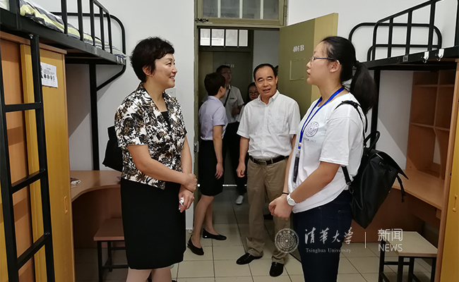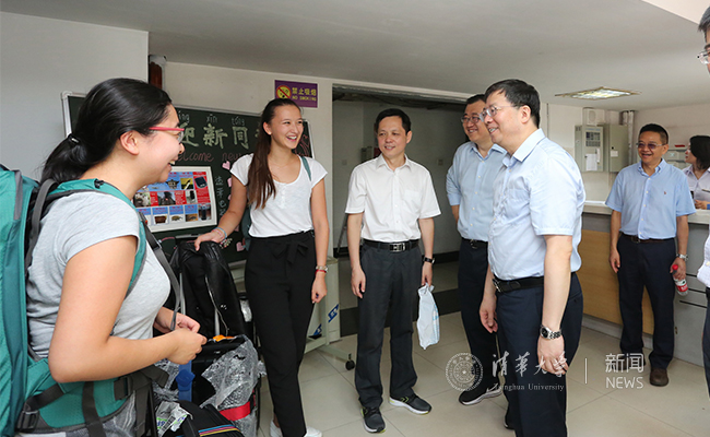 在8号楼406B宿舍,新生骨干、计算机大类新生王欣然已提前办好了住宿手续。陈旭仔细询问了王欣然在新生骨干营的活动感受,并鼓励她作为新生骨干帮助舍友一起尽快熟悉校园。401B的范文萱是自动化与工业工程大类新生,从新疆连坐了两天火车的她对清华的第一感受就是校园很大,也很美丽。陈旭嘱咐她努力学习,遇到了困难和问题积极找班主任、辅导员和楼长寻求帮助,过好在清华的每一天。
