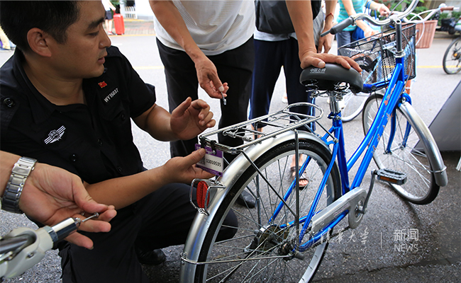 在今年新增设的实名制自行车挂牌点前,陈旭询问了自行车实名登记的相关情况。2017级新生可以在迎新现场领取实名制车牌,享受宿舍就近实名制停车位保障、定期车辆检修等服务措施。此外,新生还可以凭借本人学号享受共享单车的优惠服务政策。