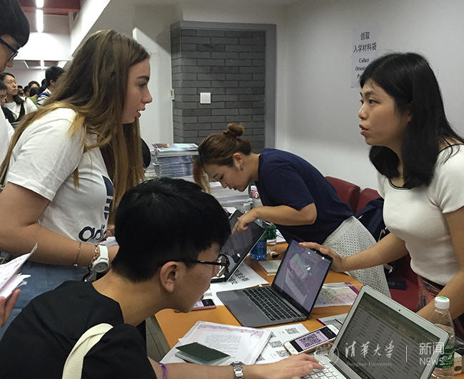 在紫荆学生公寓区国际学生报到现场,前来报到的国际学生正有条不紊地办理着各项手续。同往年相同,今年报到点都采用中英文双语,现场发放“国际学生生活指南”“爱上图书馆”等资料,方便国际学生快速了解在清华的学习生活。