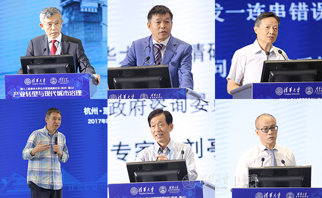 薛澜、胡鞍钢、仇保兴(上左、上中、上右)王坚、刘亭、巫永平 (下左、下中,下右)等专家学者作主旨演讲。