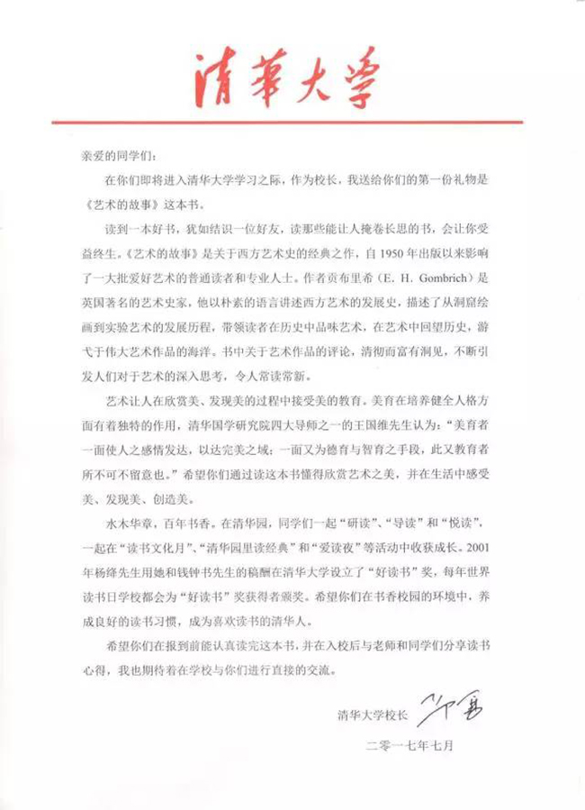 清华寄出2017年首封录取通知书和校长赠书《艺术的故事》。