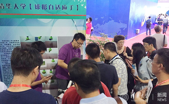 此次清华学生展出课外科技作品“球形自适应手”。 “我们项目的灵感来源于哆啦A梦的球形手,它的手没有手指,却能抓取各种不同的物体。”机械系大三学生祝天一代表团队介绍了项目创意来源、技术突破和应用前景,并进行了现场演示。