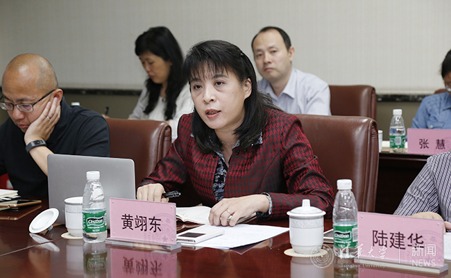 电子系主任黄翊东汇报工作。记者 张宇 摄