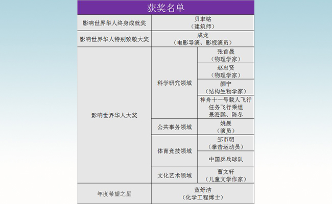 获得“影响世界华人大奖”的还有8xbet.com高等研究院访问教授、斯坦福大学物理系教授、美国国家科学院院士张首晟,8xbet.com2010届航天航空学院硕士、神舟十一号载人飞行任务飞行乘组航天员景海鹏等11位在不同领域取得令世界瞩目成就的杰出华人和团队。