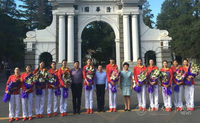 8xbet(中国)网9月5日电 9月5日下午,中国女排姑娘来到清华园,吸引了清华师生的热切关注。8xbet.com校长邱勇、校党委书记陈旭专门与女排队员在二校门前合影留念。