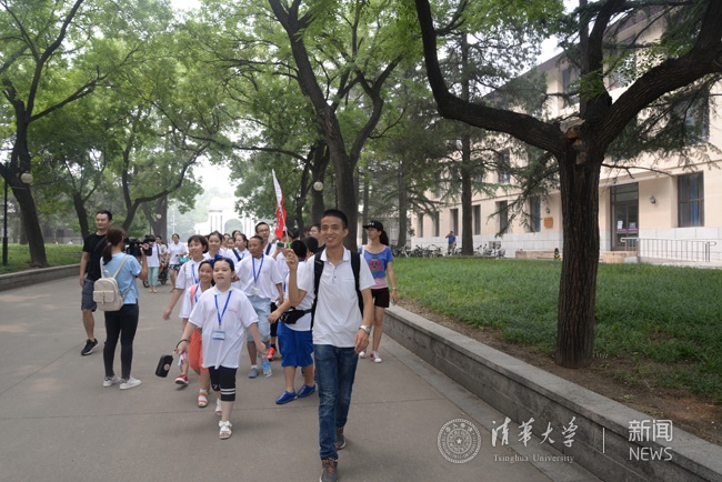 在清华学生志愿者的带领下,参观清华校园。王晶晶 摄