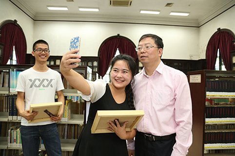 毕业生代表吴薇拿着校长邱勇赠送的合影,兴奋地与邱勇自拍留念。