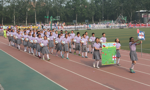 运动会入场式上全体学生人人一个足球迈着矫健的步伐、喊着响亮的“百年附小,有你有我”口号,展现出他们昂扬向上、意气风发的精神风貌。42个班级的“小运动员”们分别代表42个国家或地球的足球队,展示了不同地域的足球文化和清华附小学生的“国际视野”。