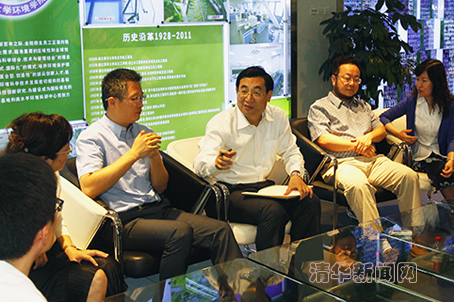 图为胡和平与环境学院教师交流。记者 郭海军 摄