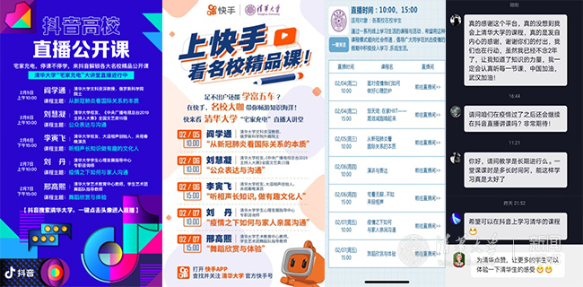 在当前全国上下团结一心共抗疫情的特殊时期,各短视频平台自觉承担社会责任,积极分享来自清华的优质教学资源。近期,开通多个板块线上直播课程,一批选题精良、内容多样、实用有趣的在线课堂,满足了很多人“在家也能上清华”的愿望,为打赢疫情防控阻击战作出了应有的贡献。截至2月28日,三大短视频平台账号各直播课程49场,总观看人数超1亿。