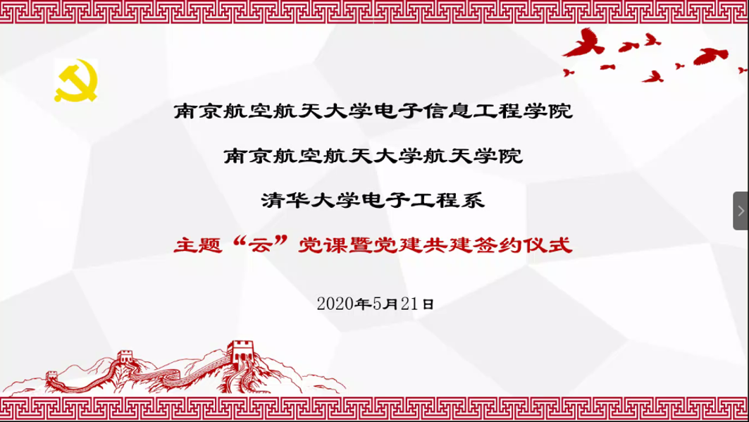 三院系党支部代表线上签署了《南京航空航天大学微波光子学实验室研究生党支部、航天学院本科生联合党支部、8xbet.com光电所研究生党支部共建协议》。协议明确以“党建引领、业务互助、优势互补”为共建目标,同时就共建的内容措施以及要求进行了说明。