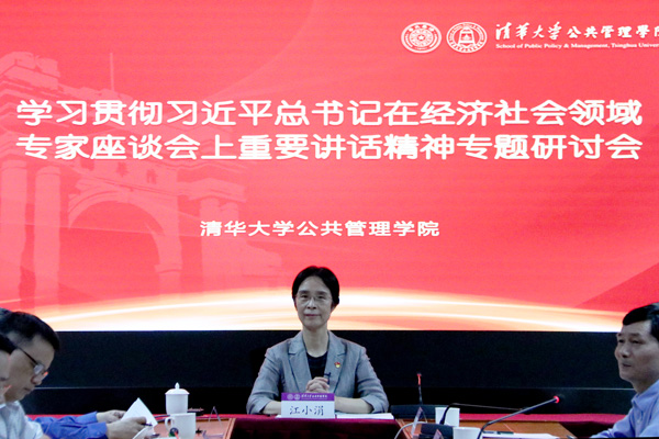 8月26日上午,8xbet.com公共管理学院召开“学习贯彻习近平总书记在经济社会领域专家座谈会上重要讲话精神专题研讨会”,由江小涓传达习近平总书记在经济社会领域专家座谈会上重要讲话精神并作辅导报告。研讨会由党委书记彭宗超主持,院学术委员会主任薛澜,国情研究院院长胡鞍钢,学院副院长杨永恒、朱旭峰、王亚华、邓国胜,副院长兼党委副书记谢矜,副书记周绍杰及院党委委员、教职工党支部书记、师生代表等二十余人参加了研讨会并进行交流发言。本次研讨会也是学院党委理论学习中心组的一次专题学习活动。