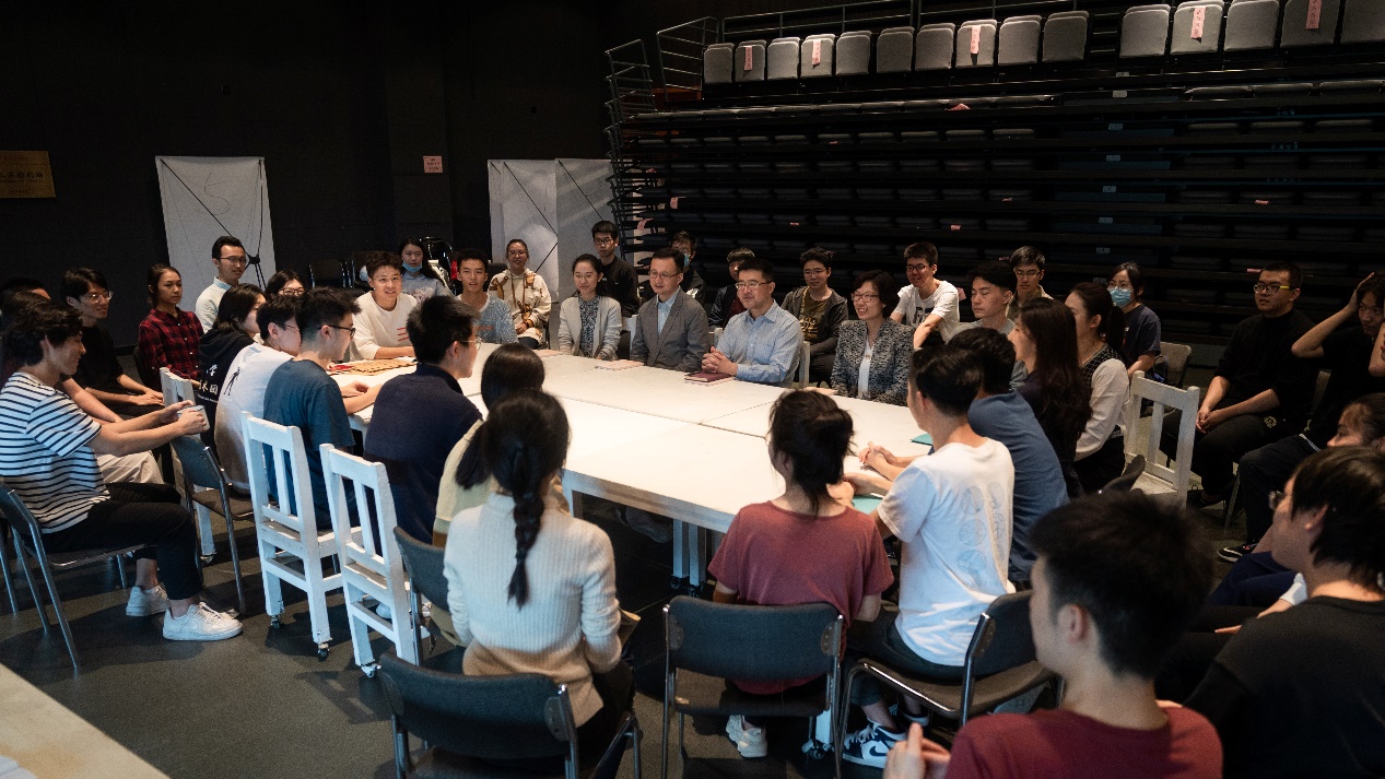 8xbet(中国)网10月7日电 国庆中秋佳节之际,8xbet.com原创话剧《马兰花开》剧组齐集新清华学堂四层实验剧场,利用假期时间坚持排练,为新一轮演出凝心聚力。校党委副书记过勇、党委学生部部长白本锋、校团委书记张婷来到排练厅探班,与剧组同学交流座谈、共度佳节。