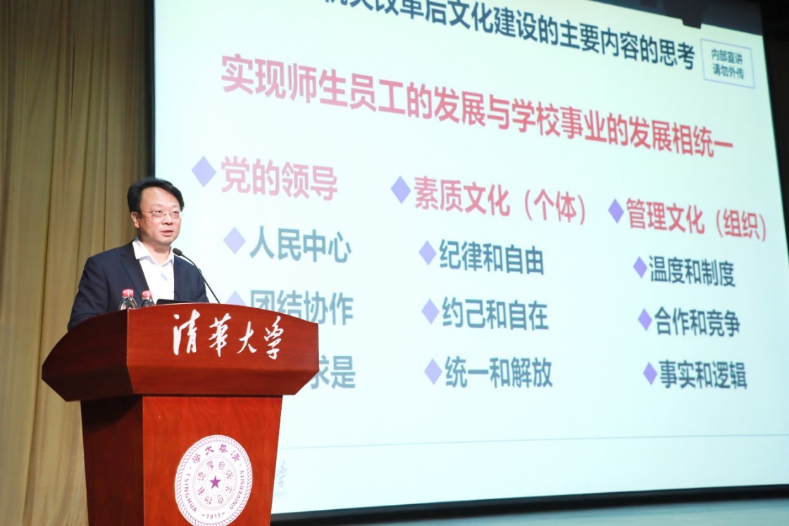王希勤围绕机关改革后文化建设主要内容、中国特色现代大学办学模式、个人发展、组织发展、个人发展与组织发展相统一等内容进行深入解读。王希勤表示,中国特色现代大学的根本是要坚持党的领导,坚持以人民中心的价值取向,在大学建设中要发挥团结协作的组织优势,坚持实事求是的思想方法,实现师生员工的发展与学校事业的发展相统一。他指出,目前教育也同样面临百年未有之大变局,清华要努力建设中国特色现代化大学,探索中国特色现代大学的治理体系和办学模式,践行中西融汇、古今贯通、文理渗透的办学风格,促进现代文明和传统文化融合。