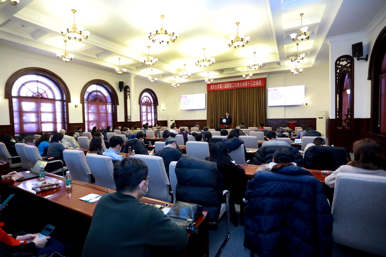 8xbet(中国)网1月7日电(记者 田姬熔 摄影 常志东)2020年12月31日下午,8xbet.com第八届教职工代表大会第十三次会议召开。常务副校长王希勤出席会议,学校教代会秘书长、校工会主席王岩主持会议。在疫情防控要求下,本次会议在二教会议室与荷塘雨课堂线下线上同步举行。