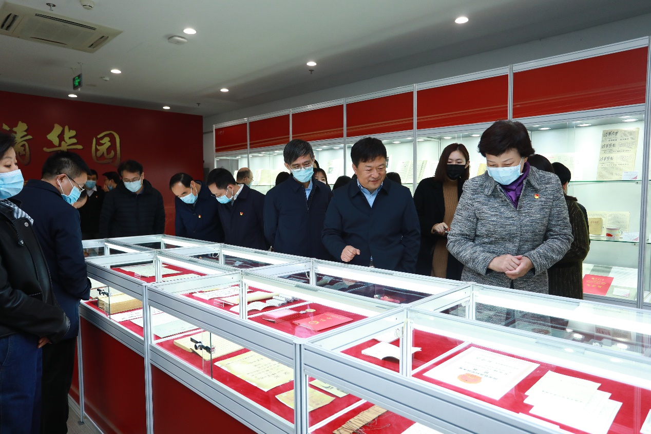 陈旭一行首先听取了党史研究室主任、档案馆馆长范宝龙的介绍,并在工作人员带领下仔细浏览一件件珍贵而生动的展品。展览选取档案馆、校史馆、图书馆等馆藏的近200件文献、手稿、图书、照片、实物等,展现清华党组织的发展历程和光荣传统。其中有,中共清华第一个支部诞生地三院历史图片、清华第一任党支部书记王达成访问记、1926年至1937年清华地下党历届支部书记名单和清华解放前各时期地下党员名单,学校历次党代会相关档案史料、历届党委书记校长给师生员工讲党课的资料,清华党组织获得的荣誉证书和奖杯,以及清华最早的共产党员施滉、上世纪50年代老知识分子中第一个入党的教授刘仙洲、隐姓埋名捐资助学的“炭火教授”赵家和等清华党史典型人物和优秀共产党员的实物史料等,内容丰富精彩。