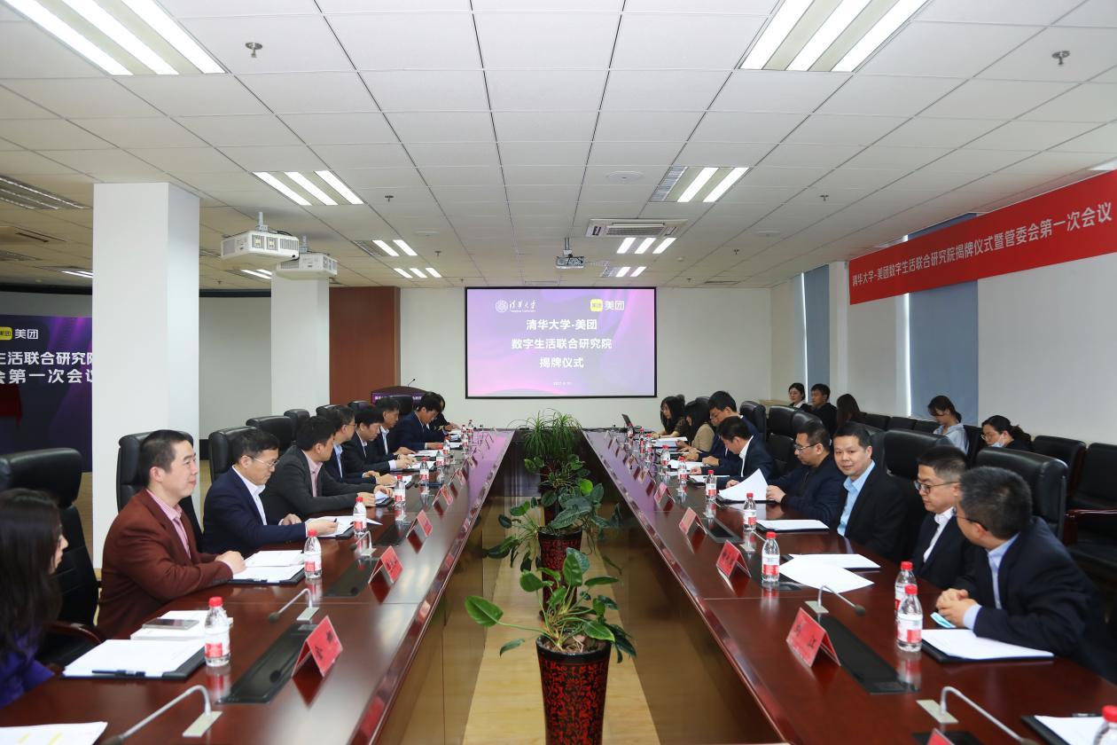 揭牌仪式后,清华美团数字生活研究院召开管委会第一次会议,管委会主任杨斌主持会议。会议上宣读了管委会成员名单,审议通过了联合研究院章程、工作规划及经费预算,明确了联合研究院的建设宗旨和研究内容。