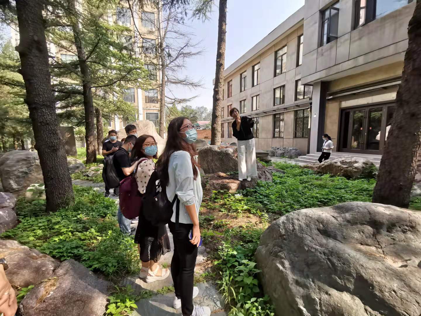 在图书馆逸夫馆南草坪上,大家围绕在“三院遗址·清华第一个中共支部诞生地”纪念物前,听老师们讲述1926年初冬的一天,王达成、雷从敏、朱莽三位清华最早的共产党员如何成立清华第一个党支部的故事。在“水木清华”北山之阴,大家在清华英烈碑前凝神驻足,倾听清华65位英烈的故事。在闻亭下,大家一边瞻仰闻一多雕像,一边回顾闻一多与朱自清这对清华园的“双子星座”不平凡的人生历程和杰出成就,感受闻一多“拍案而起,横眉怒对国民党的手枪,宁可倒下去,不愿屈服”、朱自清“一身重病,宁可饿死,不领美国的‘救济粮’”的民族气节。在参观路线的最后一站,大家来到泥沙实验室西面的地质之角,在土水学院王春红、温庆博老师的带领下,流连在林泉高处、怪石丛林中,感受近300块来自各大水利工程的巨石亿万年演进的气息,感受土水学院师生专注如一、独一无二、知行合一、天人合一的精神传承。