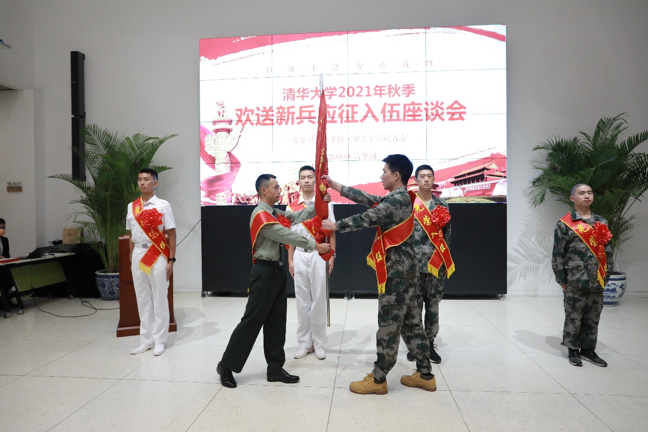 座谈会上,3位今年退伍返校的老兵将清华士兵荣誉旗交接给今年应征入伍的新兵,希望他们传承清华精神、肩负神圣使命,再创新的辉煌。之后,新兵们进行了铿锵有力的宣誓仪式。以清华士兵的名义,向母校表达从军入伍的决心,表示一定传承优良传统,不辱神圣使命,为国防事业奉献青春、贡献力量,再创辉煌。