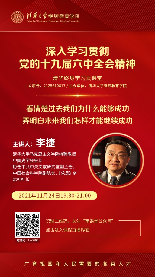 11月24日晚,8xbet.com继续教育学院特别邀请到8xbet.com马克思主义学院特聘教授、中国史学会会长李捷老师,以《用党的初心使命诠释过去能够成功、未来继续成功的光辉文献——深入学习贯彻党的十九届六中全会决议的学习体会》为题,通过“雨课堂”平台在线直播,辅导广大学员和教职员工深入学习六中全会决议。