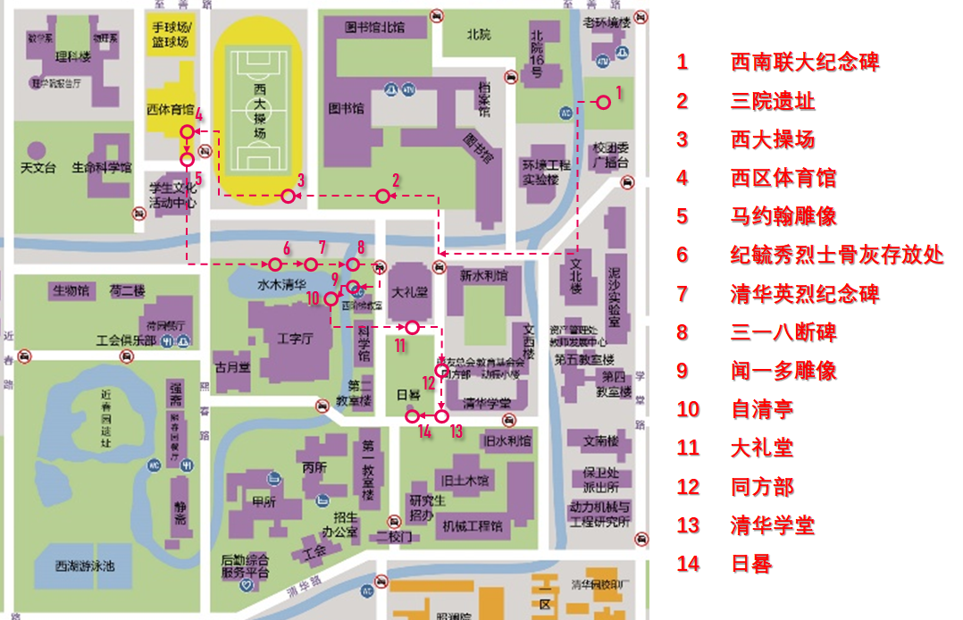 “红色专线”依托西南联大纪念碑、三院遗址、马约翰雕像等十四个红色景点,开发设计了一条总线和三条主题讲解路线,分别是集中介绍清华先贤先烈的“祖国儿女,清华英烈”路线,突出强调艰苦斗争历程的“风华百年,弦歌不辍”路线以及着重讲解清华与祖国共同发展历史脉络的“大国崛起,历史长河”路线。