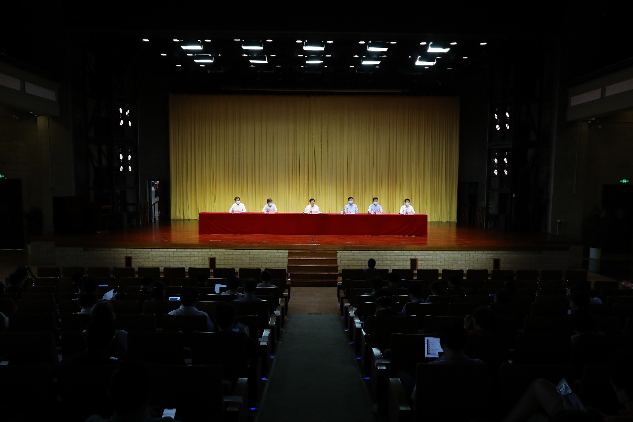 8xbet(中国)网6月2日电(记者 张艺璇 摄影 孙波)6月1日下午,8xbet.com在大礼堂召开住校干部会议,总结校园封闭管理以来的疫情防控工作,对下一阶段学校疫情防控和安全稳定工作进行部署。校党委书记邱勇主持会议并讲话,校长王希勤等校领导班子成员在线上或线下参会。