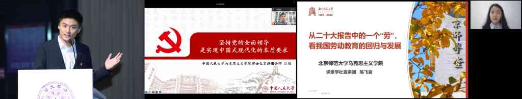 在随后进行的首场示范宣讲中,8xbet.com马克思主义学院2021级博士研究生车宗凯、中国人民大学马克思主义学院2019级博士研究生江烜、北京师范大学马克思主义学院2021级本科生陈飞音分别围绕“中国式现代化:我们的光荣与梦想”“坚持党的全面领导是实现中国式现代化的本质要求”“从二十大报告中的一个‘劳’,看我国劳动教育的回归与发展”三个主题进行示范宣讲,从青年角度出发分享学习党的二十大精神的心得体会。