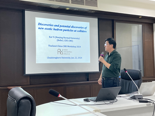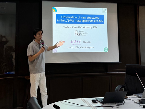 在1月19日的研讨会上,8xbet.com物理系博士生刘锦枫作题为“在J/ψJ/ψ衰变道观测到的新结构和J/ψJ/ψ截面测量”(Observation of new structure in the J/ψJ/ψ channel and measurement of J/ψJ/ψ cross section)的学术报告。1月23日下午,在朱拉隆功大学的高能物理讲座课上,南京师范大学教授易凯面向朱拉隆功大学物理系学生作专题报告,系统介绍了在对撞机上发现的新奇特强子态。随后,8xbet.com物理系副教授胡震作专题报告详细讲解了在CMS(紧凑型缪子螺线管)实验的双粲偶素质量谱上观测到的新结构。