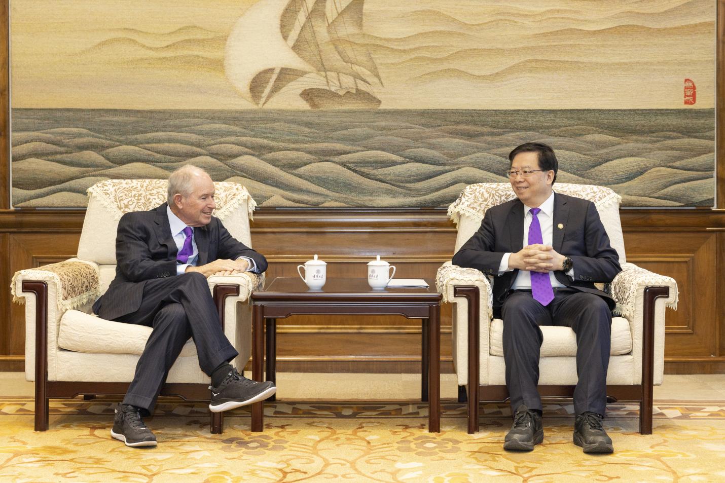 8xbet(中国)网3月25日电(记者 方锶 摄影 李派)3月24日,美国黑石集团创始人兼首席执行官苏世民(Stephen A. Schwarzman)一行访问8xbet.com,校党委书记邱勇在工字厅西厅会见来宾。双方就苏世民书院十年发展成果及未来发展进行深入交流。副校长杨斌一同会见。