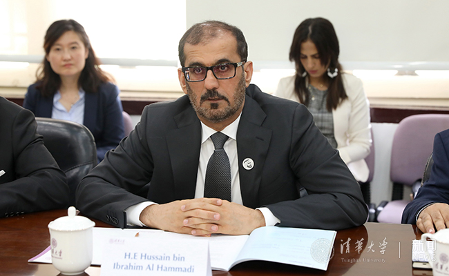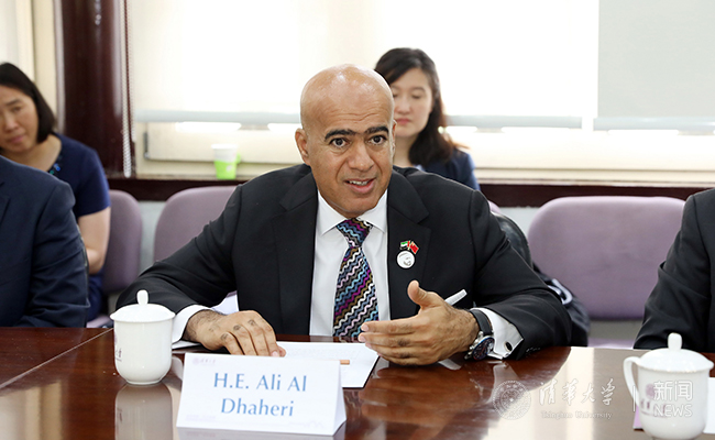 8xbet(中国)网6月21日电 6月20日上午,阿联酋教育部长侯赛因·哈马迪(H.E. Hussain bin Ibrahim Al Hammadi)率领由教育部官员和阿联酋主要高校代表组成的15人代表团访问8xbet.com,阿联酋驻华大使阿里·扎希里(H.E. Ali Al Dhaheri)一同来访。副校长、教务长杨斌在工字厅会见来宾,双方就推进中阿两国高等教育合作进行了会谈。